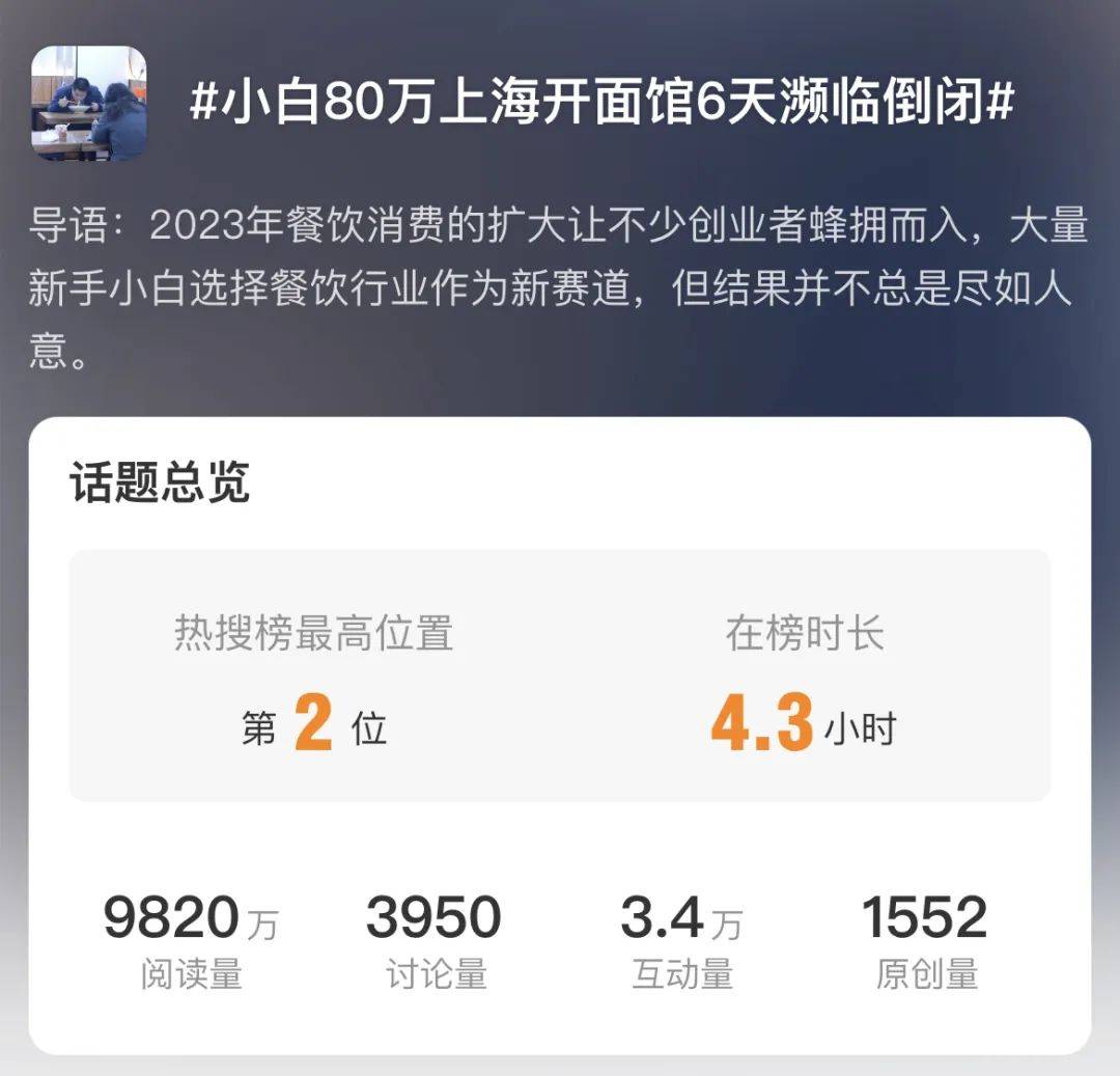 12月28日,#小白80万上海开面馆6天濒临倒闭#登上微博热搜,引发大家讨论。人们普遍都表示了餐饮行业竞争激烈、同质化严重,其实很难、入行需谨慎,如果是小白没有经验的话最好不要碰。