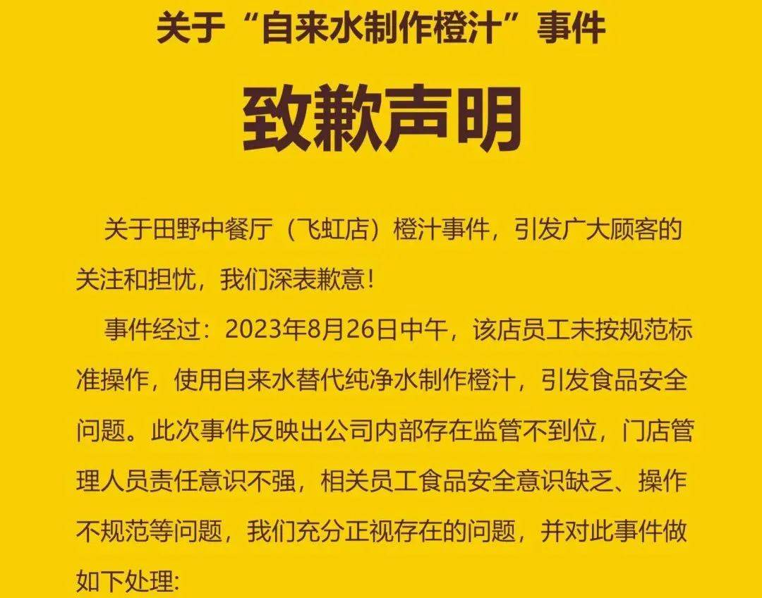2023年8月,位于浙江温州的一家餐厅就曾被曝出用拖把池的自来水勾兑橙汁给顾客喝,并且顾客中有不少小朋友。事发后,涉事门店进行致歉并立即停业整顿,对门店店长免职,对当事员工予以严厉批评教育并停职离岗培训。
