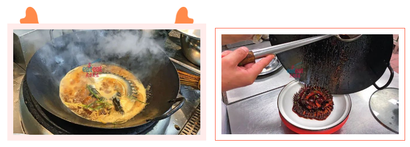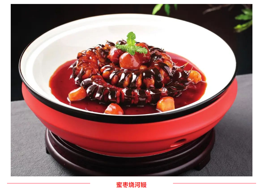 这道菜的选料和烧制的火候十分关键,鲤鱼先过油定形,再三次转火烧制入味,加之蜜枣的清甜味让菜品口味更有层次,鳗鱼因自带天然胶质,烧制时不需要额外勾芡。河鳗改刀后如蟠龙形状,寓意吉祥,成菜色泽红亮、鳗鱼酥嫩。