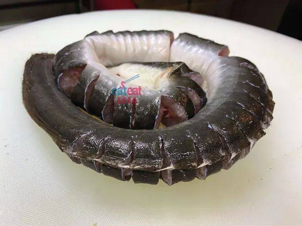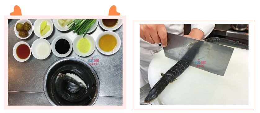 取1条重约600克的河鳗宰杀制净,沿背部用直刀法改0.8厘米宽、断主骨、使其腹部相连。