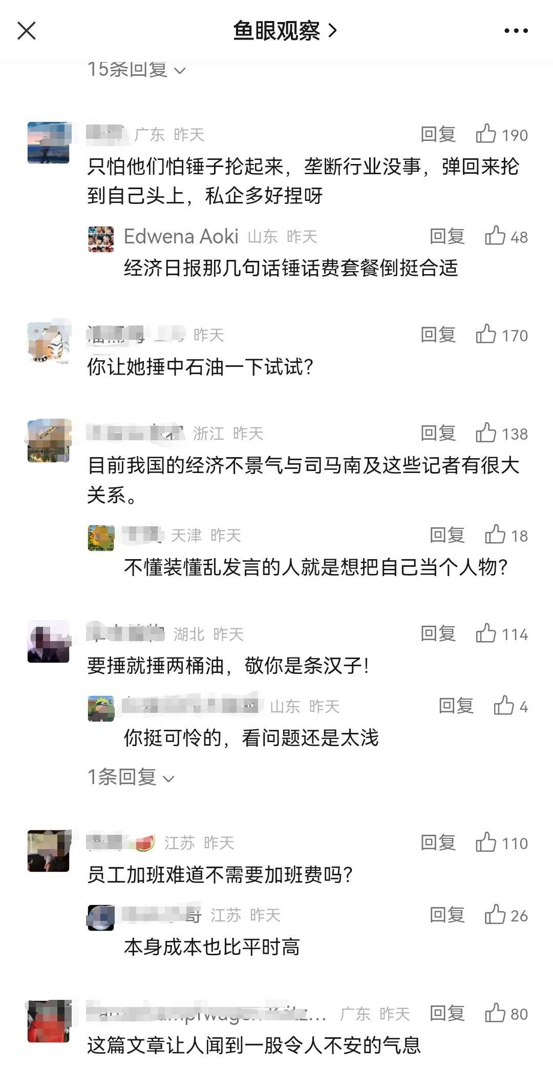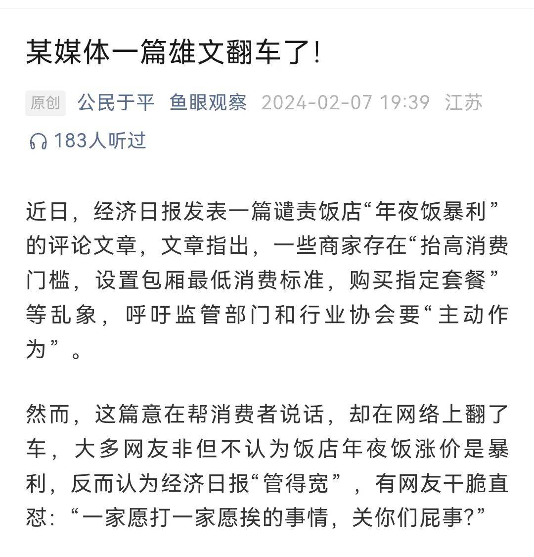 紧接着,“鱼眼观察”发表的一篇名为“某媒体一篇雄文翻车了!”将舆论反转,认为“年夜饭既非强迫消费,也非垄断经营,商家随行就市涨点价,符合市场规律,不过是正常的经济现象……”