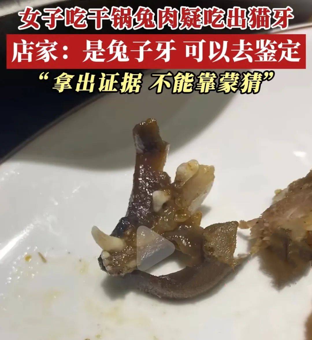 从外观来看,跟猫的牙齿极为吻合,因此客人怀疑店家用猫头代替兔头!店家却说都是凭良心做事,称已联系供应商,从源头查起……