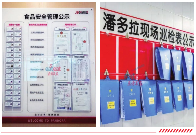 在我们后厨有一套严格的食安落地管理系统,包括食安危机事件处理流程、食物中毒事件应急预案处置要点、员工“五病”调离制度、“六级检查” 管理规定、不合格产品处置管理规定、“闭餐打卡”反馈内容等,并设立了食安看板、分色管理等看板,便于执行和监督。