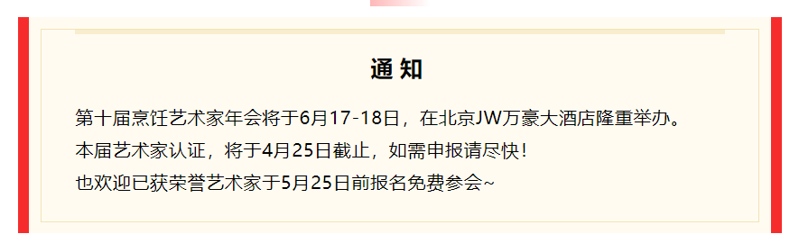 在第九届中国烹饪艺术家年会榜单发布中,根据《烹饪艺术家认证流程和标准》,司宛春(Bill Sy,美国)师傅获“功勋烹饪艺术家”认证;钟柳霞、吴一平、吕本勇、丁峰、陈致富、蔡小龙荣获“最受瞩目青年烹饪艺术家”认证;谢长顺、张金刚、郑向阳等40位师傅获“烹饪艺术家”认证,杜家熊、江锦文、闫才、钱飞等优秀厨师获得了“青年烹饪艺术家”和“烹饪艺术之星”认证。