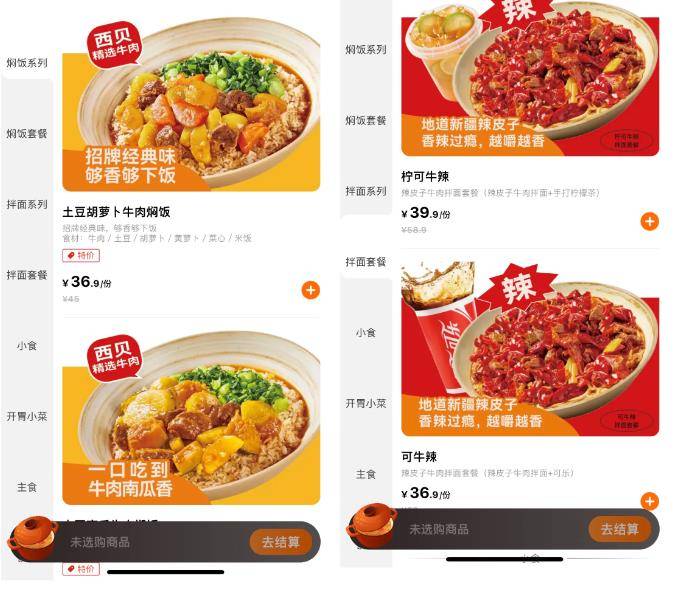 “西贝小牛焖饭与拌面”在产品上正如名字一样,主打焖饭系列、拌面系列,并推出相应包含饮料的套餐。焖饭系列包括:土豆胡萝卜牛肉焖饭、土豆南瓜牛肉焖饭、泰式咖喱牛肉焖饭和番茄芝士牛肉酱焖饭;拌面系列包括:辣皮子牛肉拌面和牛肉茄子拌面;此外,还有一些肉串、土豆丝、柠檬茶、酸奶等的小食饮料。