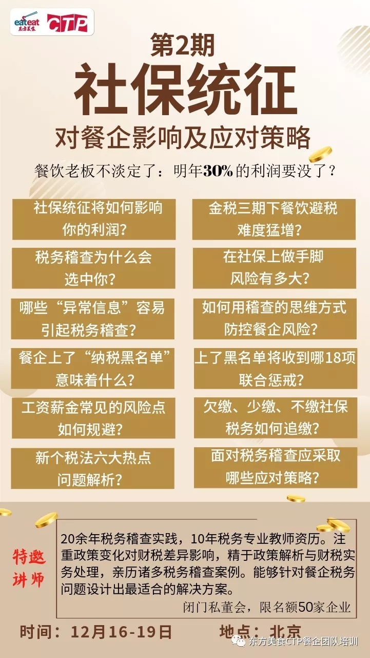 东方美食CTP特邀在餐企税务稽查领域拥有20余年的专家,用专业视角结合餐企利益的出发点,在这个秋天为你送上一份社保存利大礼——直接拯救你即将蒸发的利润。