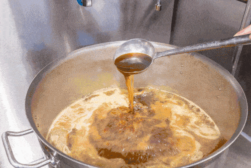 黑卤水或称红卤水:是由盐、糖、味精、香料包、绍兴酒与清水合成的。它在制作菜品时,增加染色作用,因为它带着糖的甜味,与香料混合,诱发出独特的浓香味,更与白卤的净咸香味区别开来,别具一格,特别香浓。如常见的油鸡、鹅掌、鹅胗、豉油王鸽,都是深色的卤水浸出来的,浸出的色泽是金黄色的。