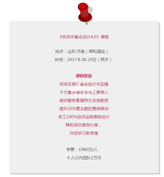 东方美食研究院积累三十多年的教学资源,推出1+7餐企团队培训模式,即(老板+采购、总厨、前厅、营销、财务、人事、店长),志在推动中国万家餐企进步,真正帮助餐企解决经营管理中的实际问题。