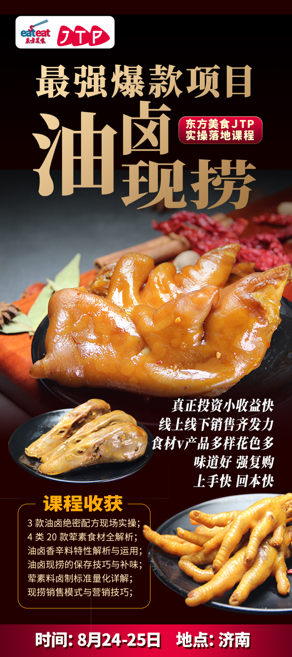 产品口味好、技术易学,毛利高销售快,投资收成快且高。卤鸭系列、卤凤爪、卤猪蹄、卤小海鲜等,来了就能学到技术与销售技巧。