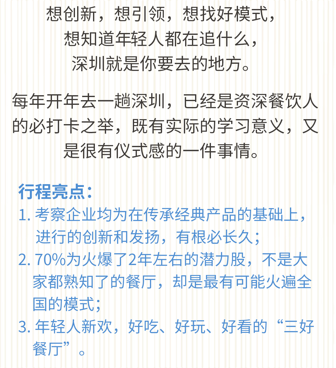 开年去一趟深圳,已成为餐饮人的必行之举,前沿、新颖、年轻、趋势、高效能、高平效……深圳餐饮被贴的标签都被他们一一证实 报名咨询18901061779(同微信)