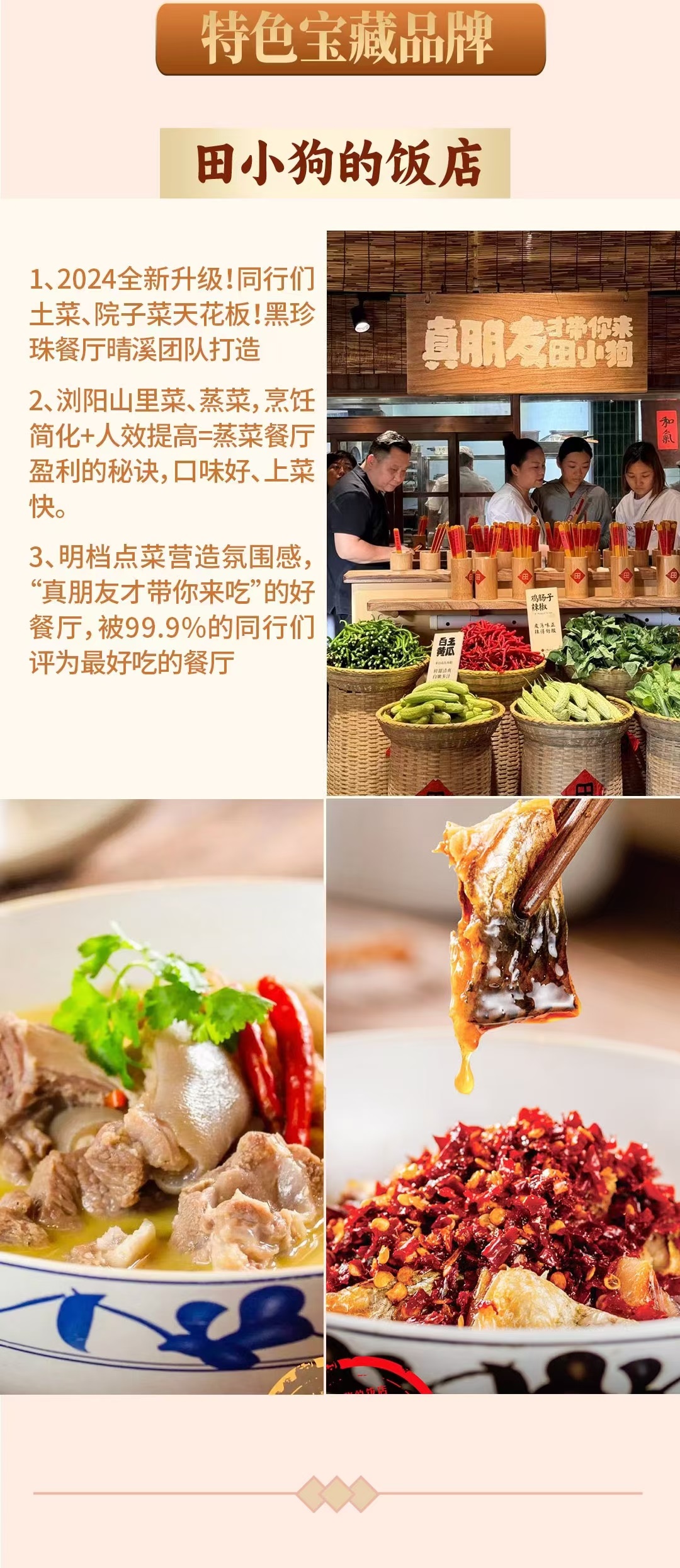 1、2024全新升级!同行们土菜、院子菜天花板!黑珍珠餐厅晴溪团队打造——【田小狗的饭店】浏阳山里菜、蒸菜,烹饪简化+人效提高=蒸菜餐厅盈利的秘诀,口味好、上菜快。明档点菜营造氛围感,“真朋友才带你来吃”的好餐厅,被99.9%的同行们评为最好吃的餐厅