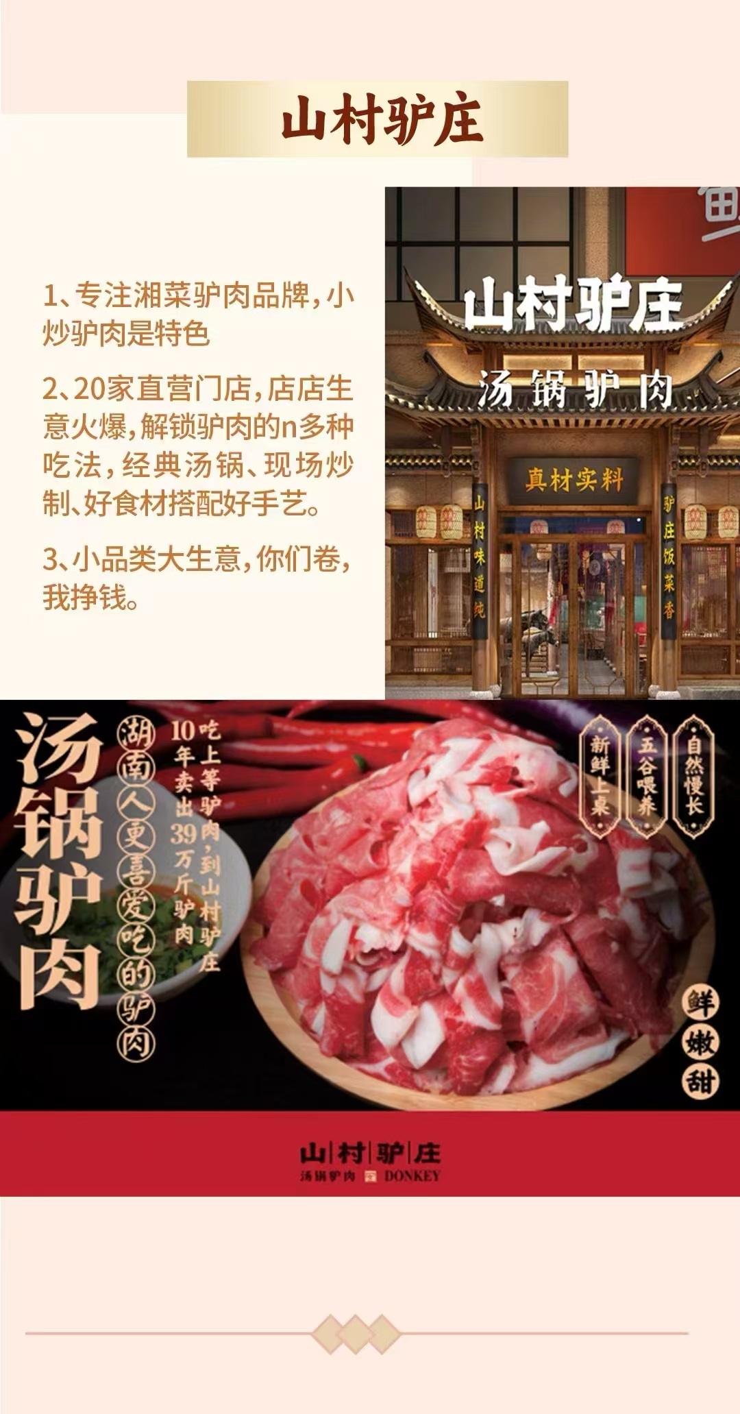 2、专注湘菜驴肉品牌,小炒驴肉是特色 ——【山村驴庄】20家直营门店,店店生意火爆,解锁驴肉的n多种吃法,经典汤锅、现场炒制、好食材搭配好手艺。