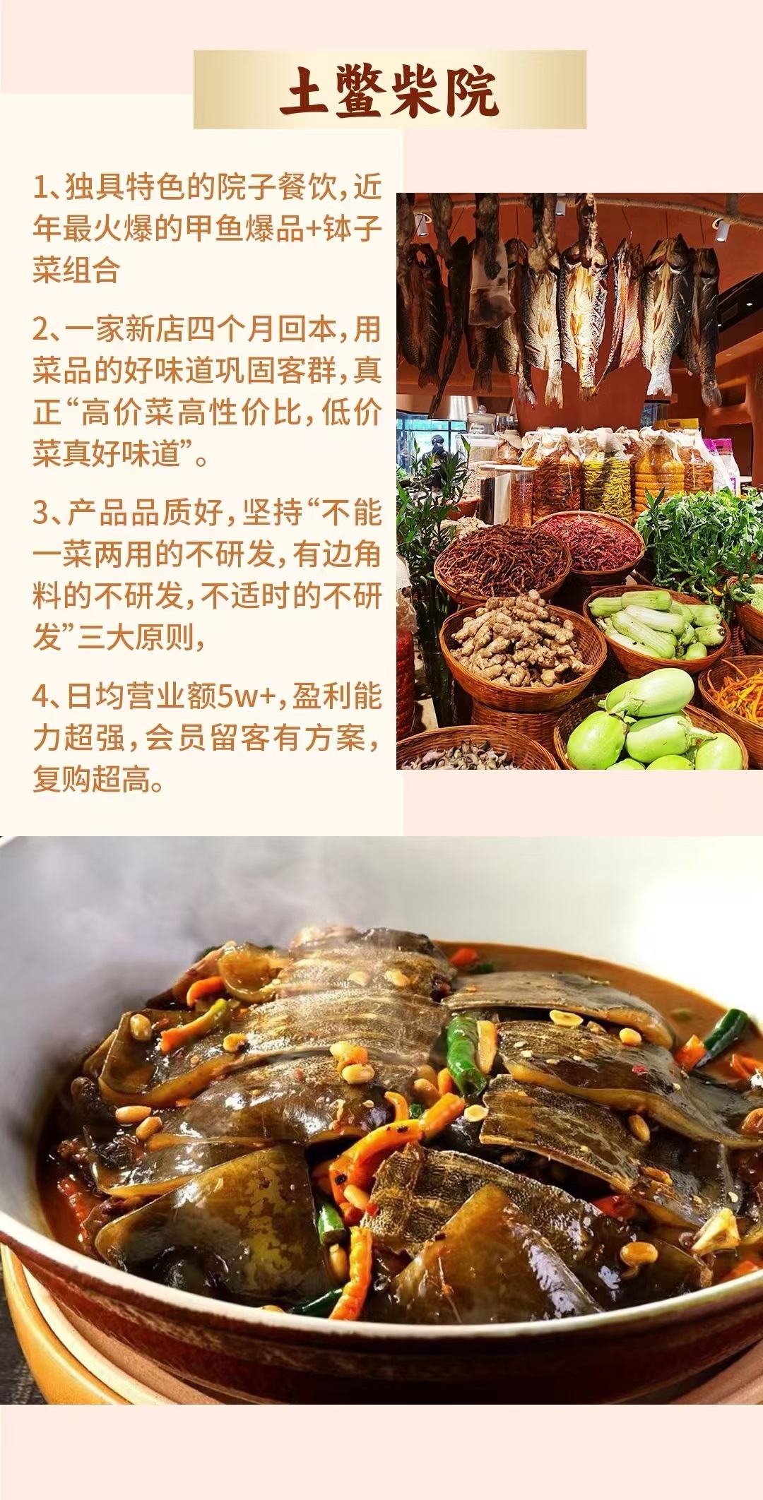 3、独具特色的院子餐饮,近年最火爆的甲鱼爆品+钵子菜组合——【土鳖柴院】一家新店四个月回本,用菜品的好味道巩固客群,真正“高价菜高性价比,低价菜真好味道”。产品品质好,坚持“不能一菜两用的不研发,有边角料的不研发,不适时的不研发”三大原则,日均营业额5w+。最会挣钱的餐厅