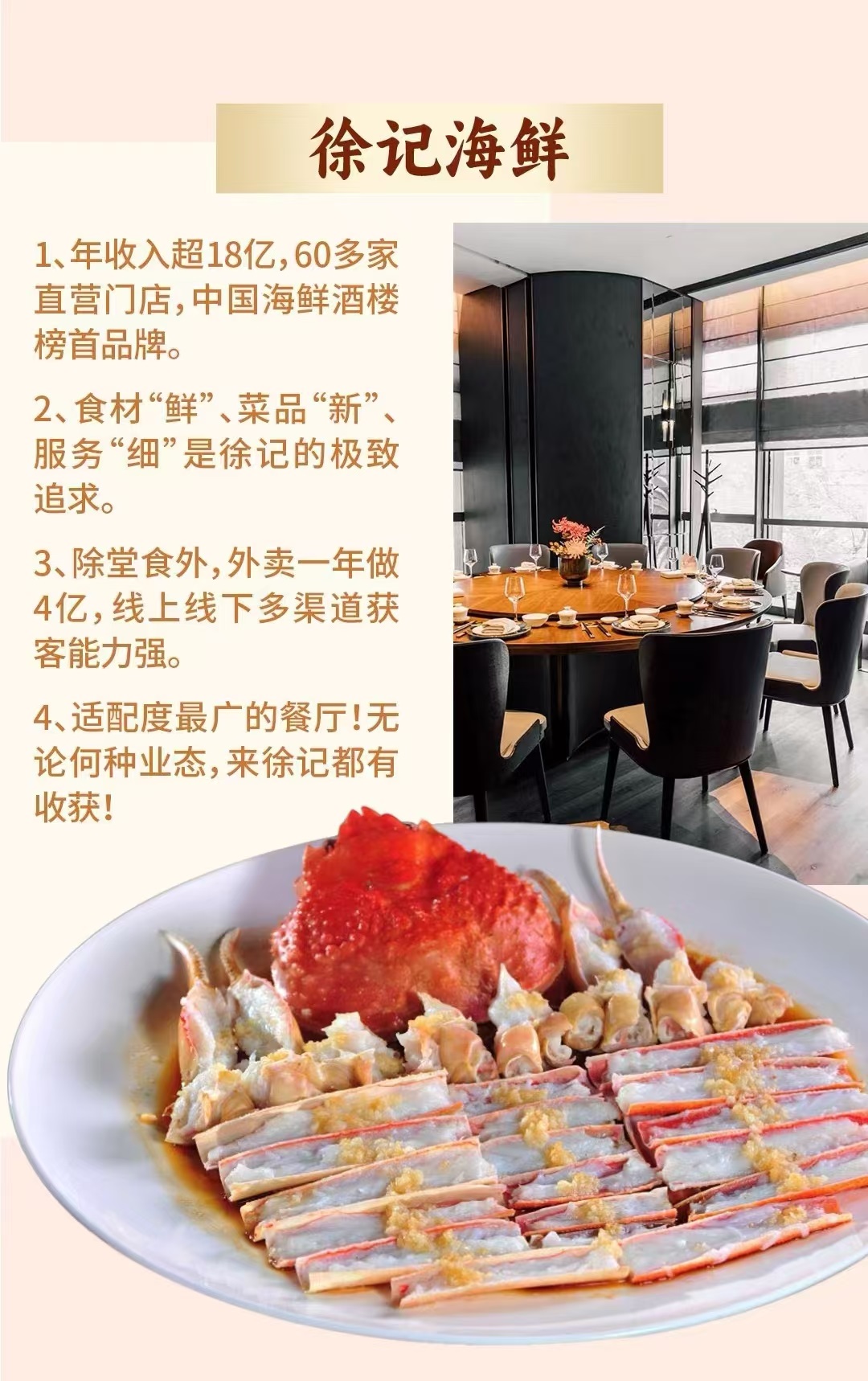 4、全国海鲜酒楼榜首品牌——【徐记海鲜】年收入超18亿,60多家直营门店,食材“鲜”、菜品“新”、服务“细”是徐记的极致追求,除堂食外,外卖一年做4亿,线上线下多渠道获客能力强。适配度最广的餐厅