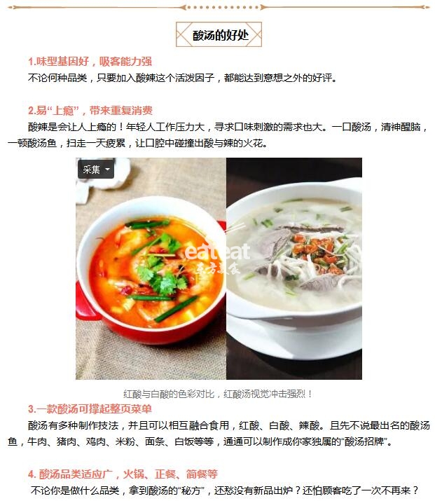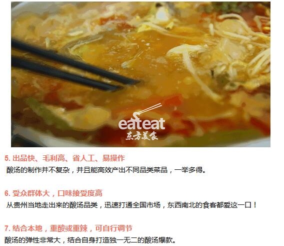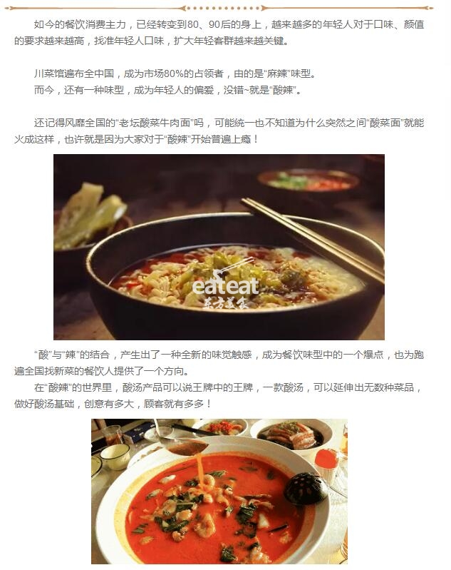 在“酸辣”的世界里,酸汤产品可以说王牌中的王牌,一款酸汤,可以延伸出无数种菜品,做好酸汤基础,创意有多大,顾客就有多多!
