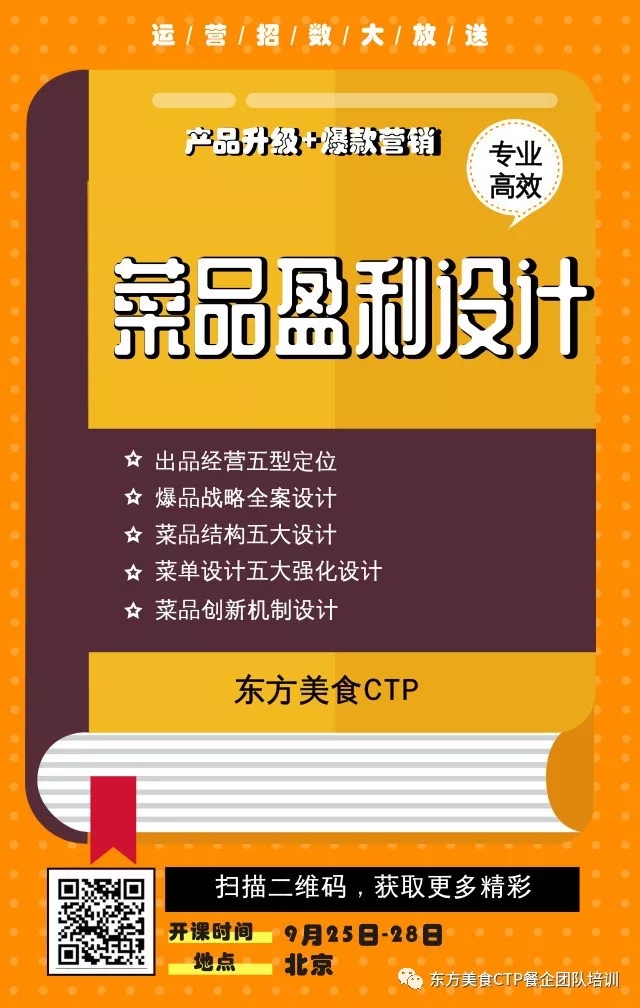 东方美食CTP9月25-28日菜品盈利设计,针对菜品盈利设计的出品经营、爆品战略、菜品结构、菜单设计、菜品创新进行全方位的剖析和分享,把产品盈利这个核心做熟做透。